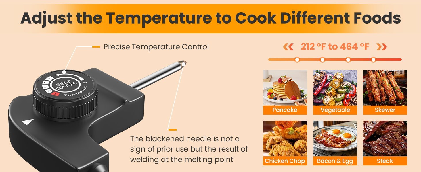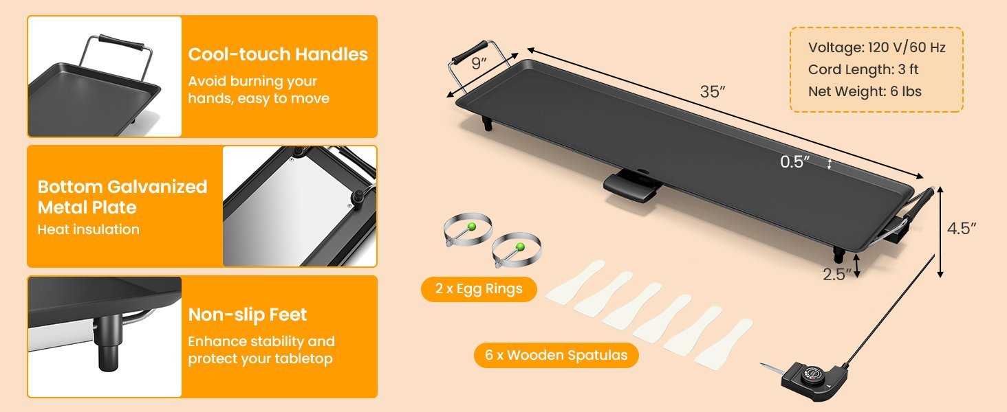 1 parrilla/1 controlador de temperatura/1 colector de aceite/6 espátulas de madera/2 anillos de huevo